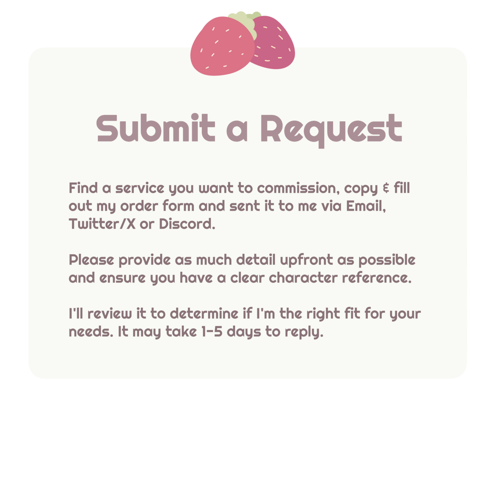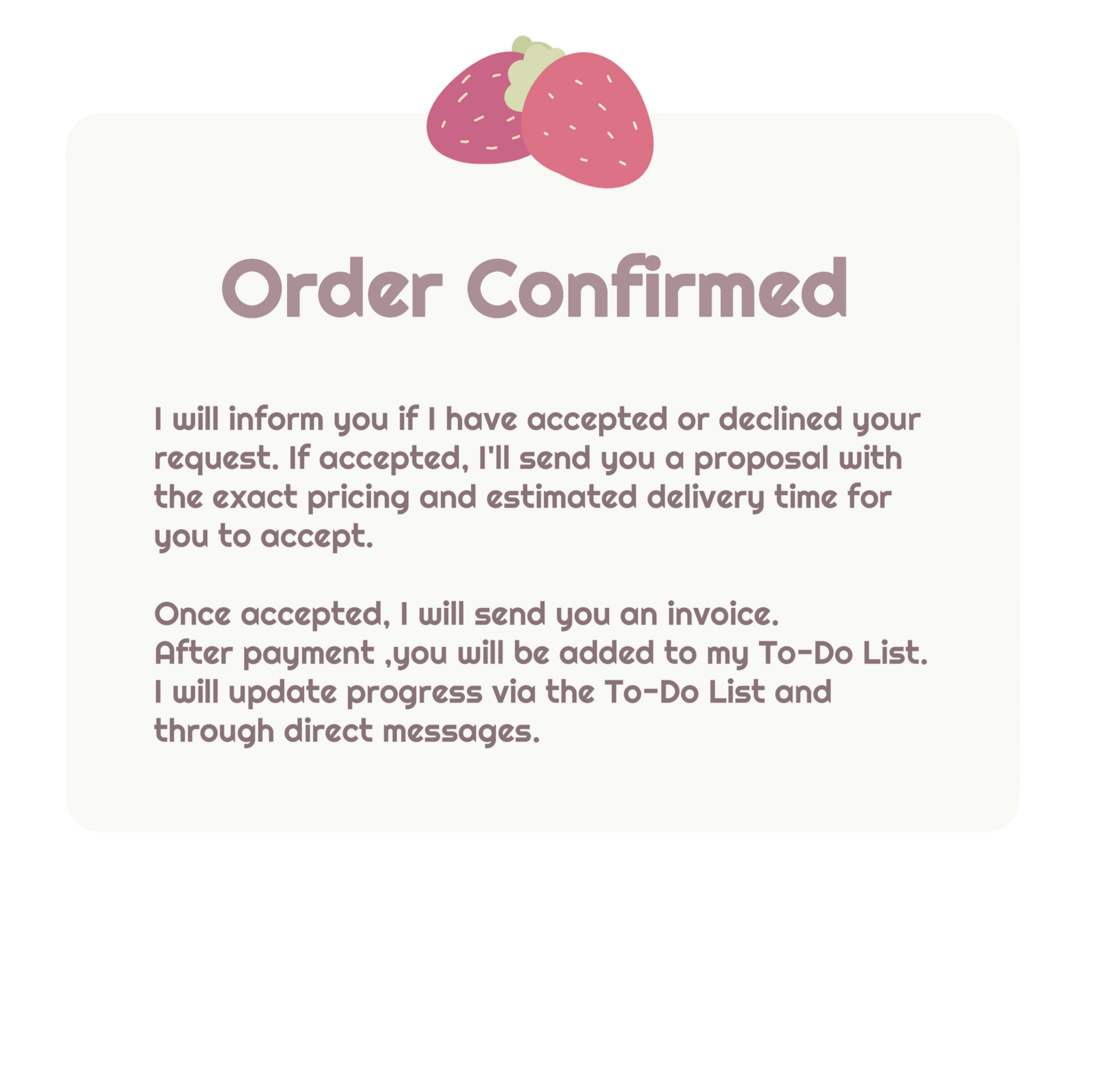 ▸Go to my services and choose a service you would to commission then go to my order form, copy and fill out the form and send it via Twitter/X, Discord or Email.▸ Upon receiving the order form, I will review it to determine whether I am the right fit for your needs. I will get back to you within 1-5 days and inform you if I accept or decline your request.▸When I accept I will send you a proposal with pricing and estimated delivery time for you to accept.▸Once the proposal is accepted. I will get your Paypal email and send you an invoice. Once paid, you will be added to my To-Do List.
