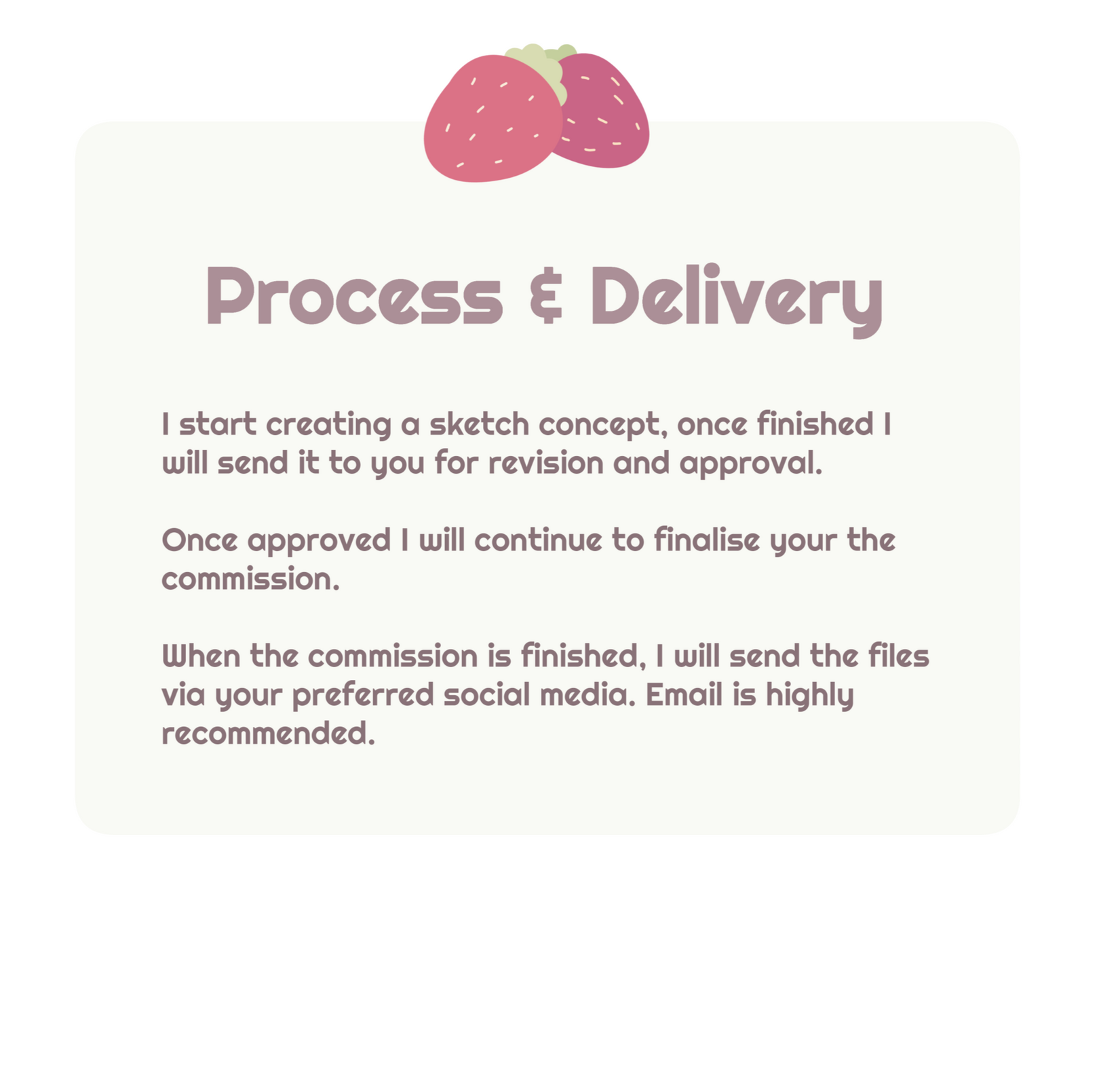 ▸I will keep you informed on any updates or delays. All will be relayed through the To-Do List and direct messages.▸ I start sketching and creating a concept. Once that sketch concept is done, I will contact you for any revisions and approval to continue. Large revisions are made during this stage only, be sure to give feedback if you would like something revised.▸Once the sketch concept is approved, I will continue to line and/or render. I will send you updates of my process time to time. Only small revisions can still be done at this stage.▸Once your commission is finalised, I will contact you via your preferred social media to send the files. I highly recommend using email, as if you lose files you can download them again.