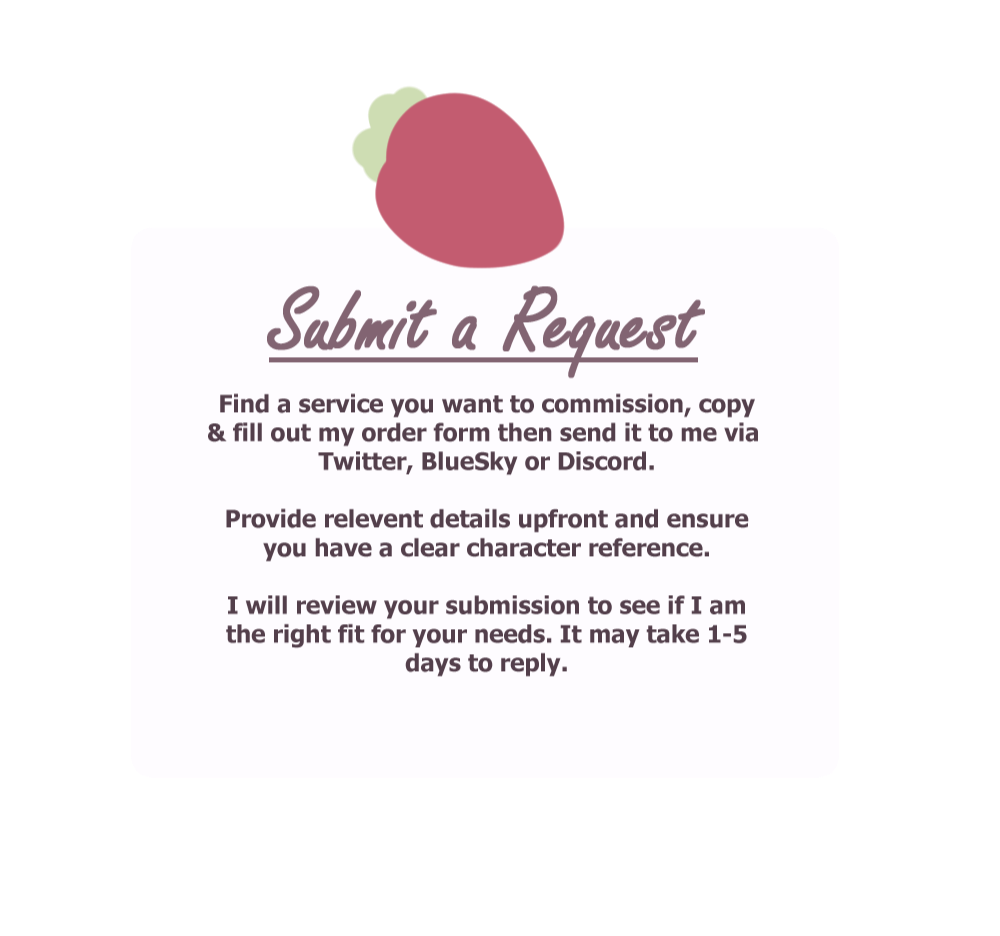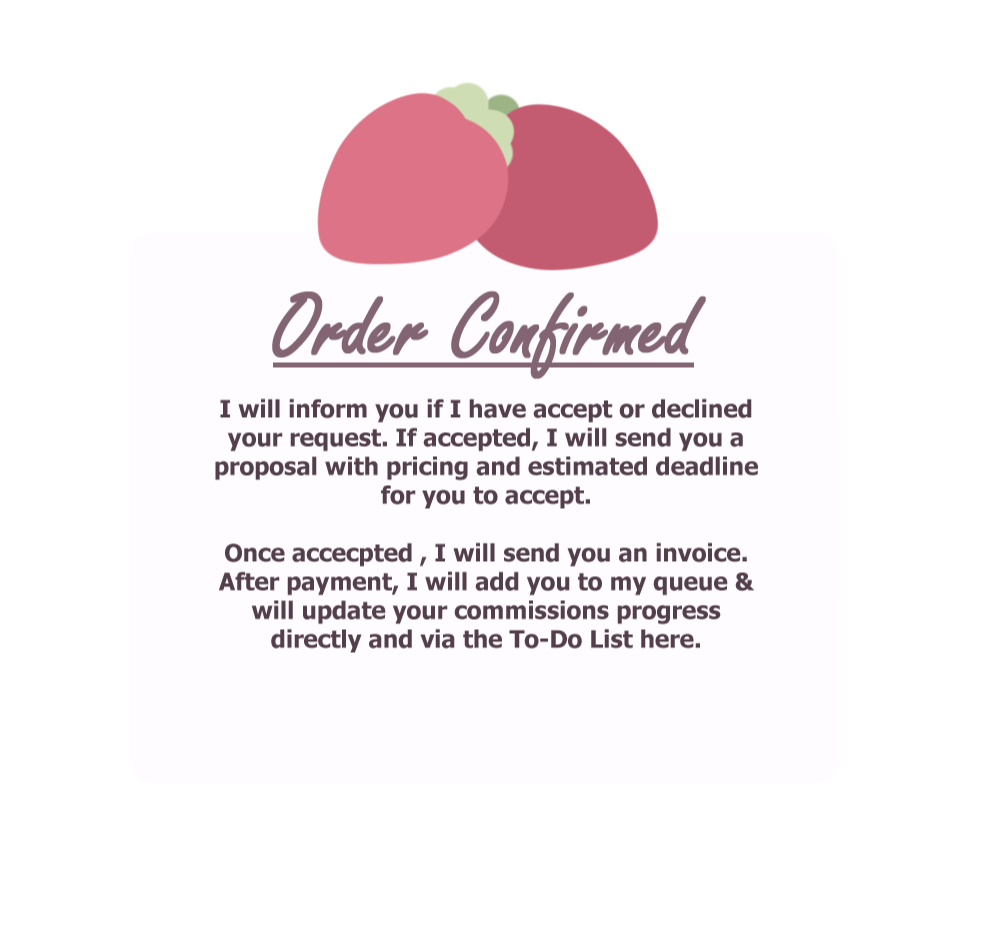 ▸Go to my services and choose a service you would to commission then go to my order form, copy and fill out the form and send it via Twitter/X, Discord or Email.▸ Upon receiving the order form, I will review it to determine whether I am the right fit for your needs. I will get back to you within 1-5 days and inform you if I accept or decline your request.▸When I accept I will send you a proposal with pricing and estimated delivery time for you to accept.▸Once the proposal is accepted. I will get your Paypal email and send you an invoice. Once paid, you will be added to my To-Do List.