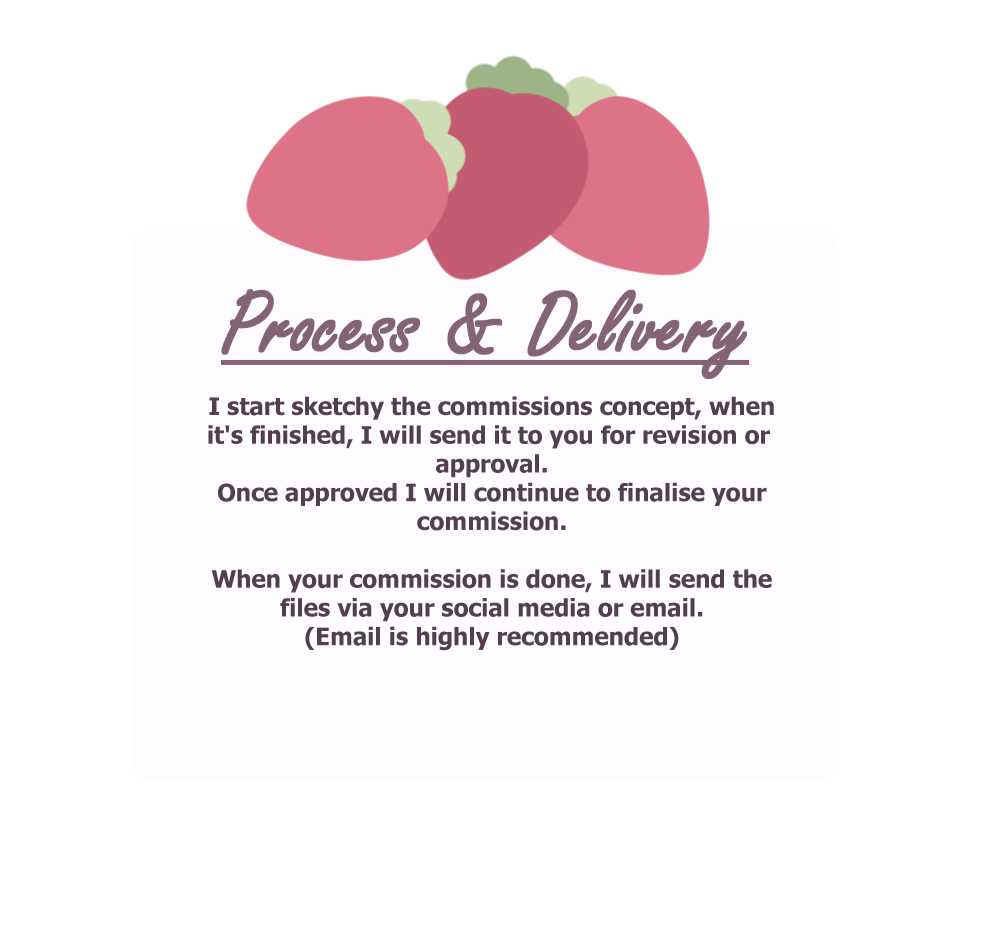 ▸Once your commission is finalised, I will contact you via your preferred social media to send the files. I highly recommend using email, as if you lose files you can find and download them easily.